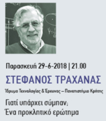 Την Παρασκευή 29 Ιουνίου και ώρα 21:00 στον κήπο του Αστεροσκοπείου Αθηνών (Λόφος Νυμφών) ο Στέφανος Τραχανάς θα δώσει ομιλία με θέμα «Γιατί υπάρχει σύµπαν; Ένα προκλητικό ερώτηµα»