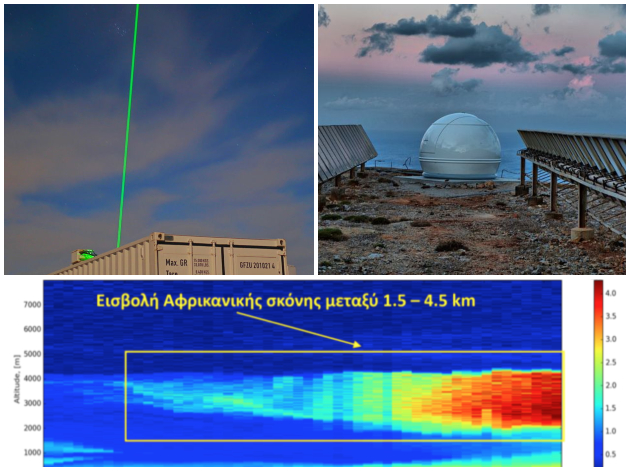 ↳ Πάνω: «Πρώτο φως» στον ουρανό των Αντικυθήρων. Το σύστημα lidar PollyXT του ΕΑΑ αμέσως μετά την έναρξη λειτουργίας του στα Αντικύθηρα. Ο θόλος του ειδικού ηλιακού φωτόμετρου CIMEL, η λειτουργία του οποίου θα εντάξει την «Παγγαία» στο παγκόσμιο δίκτυο σταθμών Aeronet της NASA. Κατασκευάστηκε σε συνεργασία με την COSMOTE, η οποία στηρίζει έμπρακτα το εγχείρημα του ΕΑΑ. Κάτω: Η πρώτη μέτρηση του lidar PollyXT, όπου καταγράφεται η μεταφορά αφρικανικής σκόνης πάνω από τα Αντικύθηρα