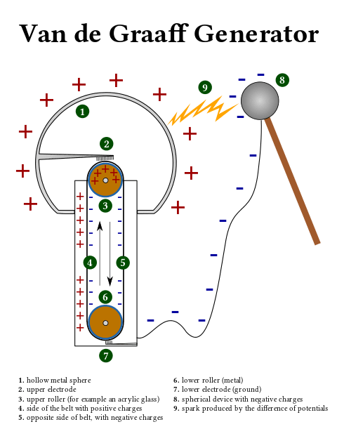 Θέτοντας σε λειτουργία την ηλεκτροστατική γεννήτρια VandeGraaff ελεύθερα ηλεκτρόνια μεταφέρονται από την αγώγιμη σφαίρα στη γη και η σφαίρα φορτίζεται θετικά. Οι γεννήτριες Van der Graaff μπορούν να συσσωρεύσουν φορτίο που αντιστοιχεί σε πολύ μεγάλες διαφορές δυναμικού – μέχρι και χιλιάδες Volt.