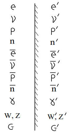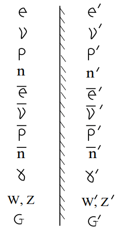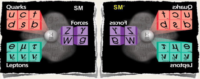 Το παραπάνω σχήμα παριστάνει τις αλληλεπιδράσεις των γνωστών στοιχειωδών σωματιδίων. Οι δυνάμεις είναι κατοπτρικά συμμετρικές σαν μια τέλεια σφαίρα, εκτός από την ασθενή αλληλεπίδραση, που παριστάνεται ως ένα αριστερό χέρι. Το είδωλο μέσα στον καθρέπτη προφανώς δεν ταυτίζεται με το πρωτότυπο, υποδηλώνοντας το γεγονός ότι οι αλληλεπιδράσεις των γνωστών σωματιδίων δεν είναι κατοπτρικά συμμετρικές.