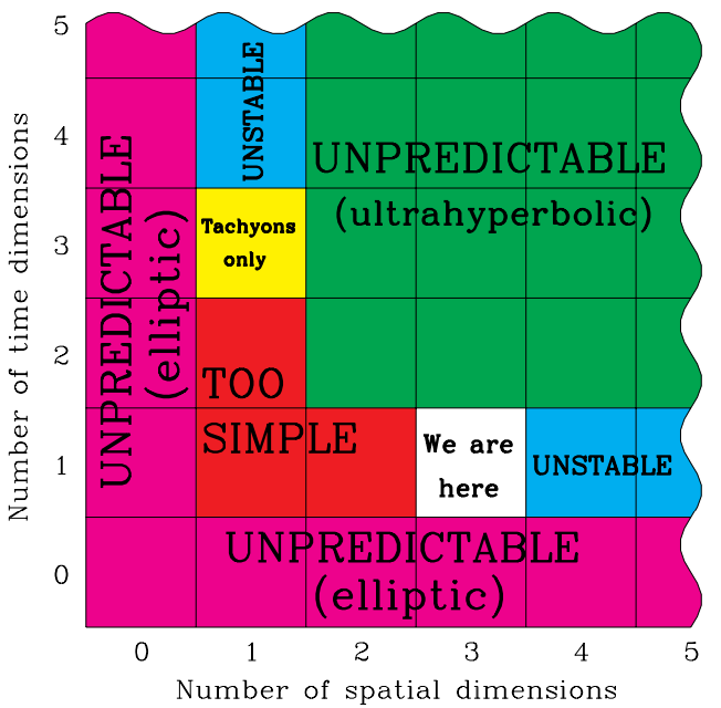 Σε ένα άρθρο που έγραψε ο Max Tegmark [On the dimensionality of spacetime] αποδεικνύεται ότι η αλλαγή του αριθμού των διαστάσεων θα εξάλειφε την βασική μαθηματική ιδιότητα της φυσικής που μας επιτρέπει να κάνουμε προβλέψεις, καθιστώντας έτσι άνευ νοήματος την εξέλιξη του εγκεφάλου. Οι τρεις χωρικές διαστάσεις και η μια χρονική αποτελούν την μόνη βιώσιμη επιλογή, σύμφωνα με το παραπάνω γράφημα.