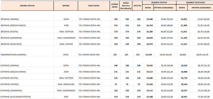 Στη συνέχεια δίνονται οι βάσεις εισαγωγής για τα τμήματα Φυσικής, του Μαθηματικού Αθήνας και των Ιατρικών σχολών. Ενδιαφέρον έχουν τα μόρια των μαθητών που μπήκαν πρώτοι στο Μαθηματικό και Φυσικό Αθήνας: