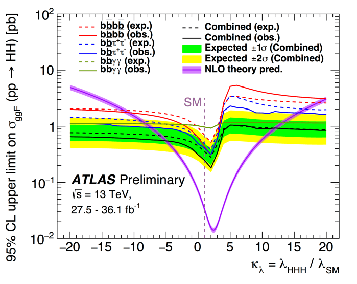 Οι φυσικοί έχουν εισάγει τον παράγοντα κλ, ο οποίος μας δείχνει αν η αυτο-σύζευξη Higgs διαφέρει από την πρόβλεψη του Καθιερωμένου Προτύπου (οπότε η ερμηνεία της θα απαιτούσε νέα φυσική). Ο πρόσφατος στατιστικός συνδυασμός των αναζητήσεων HH του ATLAS περιορίζει την τιμή κλ μεταξύ των τιμών -5,0 και +12,1, με 95% βεβαιότητα. Είναι ο πιο αυστηρός περιορισμός που έγινε για την παράμετρο κλ μέχρι σήμερα.