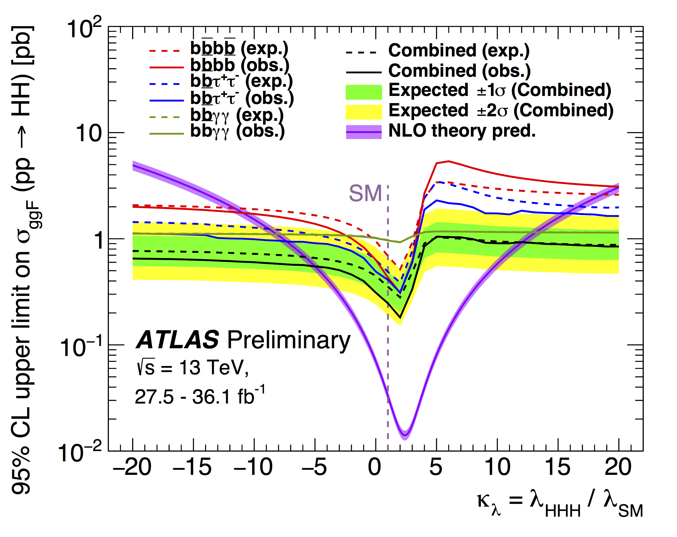 Οι φυσικοί έχουν εισάγει τον παράγοντα κλ, ο οποίος μας δείχνει αν η αυτο-σύζευξη Higgs διαφέρει από την πρόβλεψη του Καθιερωμένου Προτύπου (οπότε η ερμηνεία της θα απαιτούσε νέα φυσική). Ο πρόσφατος στατιστικός συνδυασμός των αναζητήσεων HH του ATLAS περιορίζει την τιμή κλ μεταξύ των τιμών -5,0 και +12,1, με 95% βεβαιότητα. Είναι ο πιο αυστηρός περιορισμός που έγινε για την παράμετρο κλ μέχρι σήμερα.