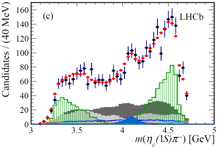 Το σωματίδιο Zc–(4100) (μπλε συντονισμός κάτω) συνεισφέρει στο αντίστοιχο «καρούμπαλο» των πειραματικών δεδομένων.