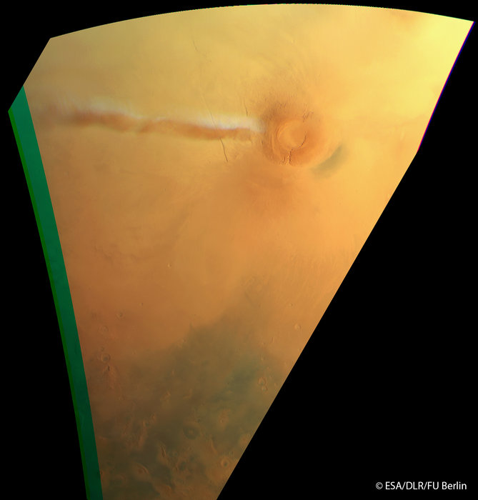 Σε φωτογραφία, η οποία τραβήχτηκε από το διαστημόπλοιο του Ευρωπαϊκού Οργανισμού Διαστήματος Mars Express, διαφαίνεται ένα μακρύ, λευκό σύννεφο, μήκους περίπου χιλίων μιλίων, το οποίο μοιάζει να «βγαίνει» μέσα από ένα τεράστιο ηφαίστειο.