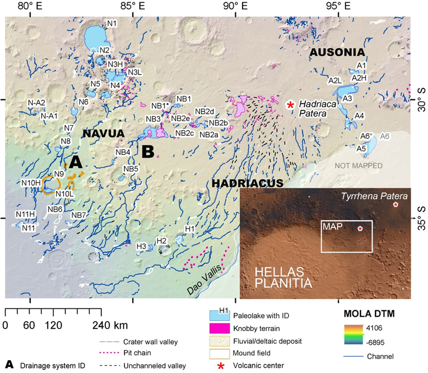 Οι επιστήμονες της Αμερικανικής Διαστημικής Υπηρεσίας (NASA) και του Ινστιτούτου Αναζήτησης Εξωγήινης Νοημοσύνης (SETI), με επικεφαλής τον Χένρικ Χαργκιτάι, που έκαναν τη σχετική δημοσίευση στο περιοδικό αστροβιολογίας «Astrobiology», βρήκαν βάσιμες ενδείξεις ότι στο νοτιοανατολικό τμήμα της «Hellas» στο νότιο ημισφαίριο του γειτονικού πλανήτη υπήρχαν 34 παλαιολίμνες νερού, ενώ έως τώρα μόνο τέτοια πανάρχαια λίμνη είχε εντοπισθεί.