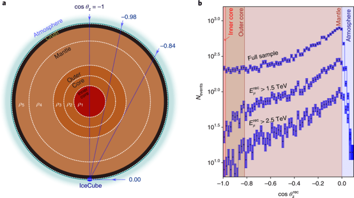 Όταν πρωτόνια και άλλα σωματίδια υψηλής ενέργειας από το διάστημα αλληλεπιδρούν με την ατμόσφαιρα παράγονται νετρίνα υψηλής ενέργειας. Αυτά τα νετρίνα διανύουν ολόκληρη τη Γη χωρίς να αλληλεπιδράσουν, και πολύ σπάνια απορροφώνται από ατομικούς πυρήνες. Από το πόσο συχνά σταματούν αποκαλύπτεται η πυκνότητα της ύλης που διασχίζουν.