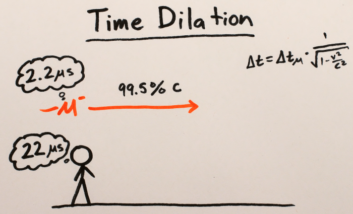 Μιόνια παράγονται στα υψηλά στρώματα της ατμόσφαιρας από την κοσμική ακτινοβολία. Τα μιόνια που κινούνται σχεδόν με την ταχύτητα του φωτός στο χρονικό διάστημα 2,2 μs θα έπρεπε να διανύουν μια απόσταση περίπου 650 μέτρων. Δεδομένου ότι δημιουργούνται σε μεγάλο υψόμετρο, τότε ένα ελάχιστο ποσοστό θα έπρεπε να επιβιώνει μέχρι την επιφάνεια της Γης. Κι όμως τα μιόνια καταφέρνουν το φαινομενικά απίθανο, να φτάσουν στην επιφάνεια της Γης! Πως το καταφέρνουν;