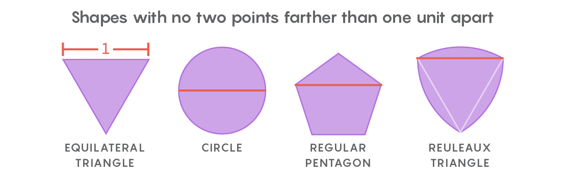 Το παράδειγμα που ακολουθεί είναι αρκετά διαφωτιστικό σχετικά με το πρόβλημα καθολικής επικάλυψης του Lebesgue. Στην παρακάτω εικόνα υπάρχουν τέσσερα διαφορετικά σχήματα. Σε κάθε σχήμα δεν υπάρχουν δυο σημεία που να απέχουν απόσταση μεγαλύτερη από τη μονάδα. Ο κύκλος είναι το πιο προφανές σχήμα με «διάμετρο 1», αλλά υπάρχουν άπειρα τέτοια σχήματα, όπως το ισόπλευρο τρίγωνο, το κανονικό πεντάγωνο και το τρίγωνο Reuleaux. Αυτή η ποικιλία σχημάτων κάνει πολύ δύσκολη την εύρεση του ελάχιστου εμβαδού που θα τα επικάλυπτε όλα.
