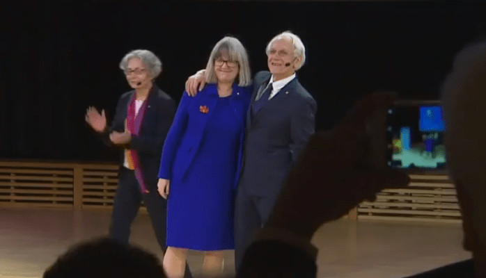 Οι Gérard Mourou και η Donna Strickland αποθεώνονται από το κοινό μετά το τέλος της ομιλίας του Mourou