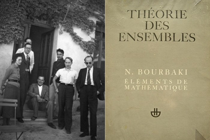 Αριστερά: Οι Nicolas Bourbaki (Dieulefit, 1938). Από αριστερά προς τα δεξιά, Charles Pisot, André Weil, Jean Dieudonné, Claude Chabauty, Charles Ehresmann, Jean Delsarte. Στην άκρη αριστερά η φιλόσοφος Simone Weil. (Πηγή φωτογραφίας: Wikipedia). Δεξιά: «Το πέρασμα από το υπερσύνθετο στο πολύ απλό και από εκεί πάλι προς τα πάνω, στην κατασκευή του υπερσύνθετου, έτσι όπως παρουσιάζεται στη ‘‘Θεωρία των Συνόλων’’, μου φάνηκε ότι κινούνταν στα όρια της μαγείας, μιας μαγείας όμως αληθινής, όχι σαν των ταχυδακτυλουργών», γράφει ο Απόστολος Δοξιάδης. (Στη φωτογραφία η έκδοση του βιβλίου «Θεωρία των Συνόλων» είναι του 1970).