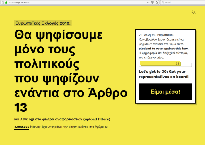 Οι εκλεγμένοι εκπρόσωποί στο Ευρωπαϊκό Κοινοβούλιο θα έχουν μια τελευταία ευκαιρία να απορρίψουν το άρθρο 13 όταν θα τεθεί στην τελική ψηφοφορία λίγο πριν από τις επόμενες εκλογές στην ΕΕ. Για αυτό το λόγο η πανευρωπαϊκή καμπάνια https://pledge2019.eu/el καλεί όσους τους Ευρωπαίους πολίτες να απαιτήσουν από τους ευρωβουλευτές τους να καταψηφίσουν τα άρθρα 11 και 13. Διαφορετικά: