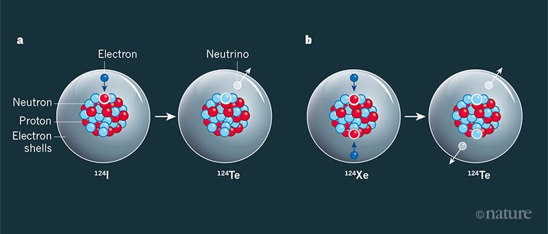 a, An iodine-124 atom can decay with a half-life of 4.2 days to an atom of tellurium-124, through a process called electron capture. The nucleus of the iodine-124 atom captures an electron from the electron shells that surround it. A proton (circled) in the nucleus is converted into a neutron, and a neutrino is emitted. b, A xenon-124 atom cannot decay by electron capture, because of the law of energy conservation. However, it can decay with an extremely long half-life to a tellurium-124 atom, through a process known as two-neutrino double electron capture. The xenon-124 nucleus captures two electrons from the surrounding electron shells, which results in the conversion of two protons (circled) into neutrons, and the emission of two neutrinos. The XENON Collaboration2 has measured the half-life of this process to be 1.8 × 1022 years — about one trillion times the age of the Universe.