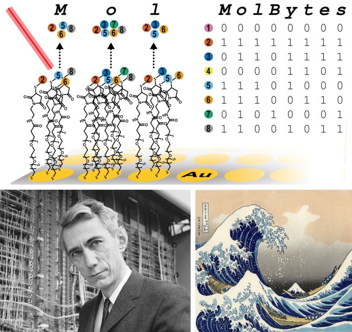 Πάνω: Η νέα μέθοδος αποθήκευσης πληροφοριών σε μόρια. Κάτω: Ο Claude Elwood Shannon (αριστερά), μαθηματικός, ηλεκτρολόγος μηχανικός και κρυπτογράφος γνωστός ως «ο πατέρας της θεωρίας της πληροφορίας» και «Το μεγάλο κύμα» του Katsushika Hokusai (δεξιά), είναι οι πρώτες εικόνες που αποθηκεύτηκαν με τη νέα μέθοδο από την ερευνητική ομάδα του Brian Cafferty.