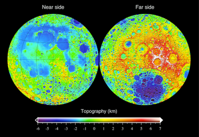 Τοπογραφία της αθέατης πλευράς της Σελήνης. Ο διακεκομμένος κύκλος δείχνει τη θέση της ανωμαλίας μάζας.