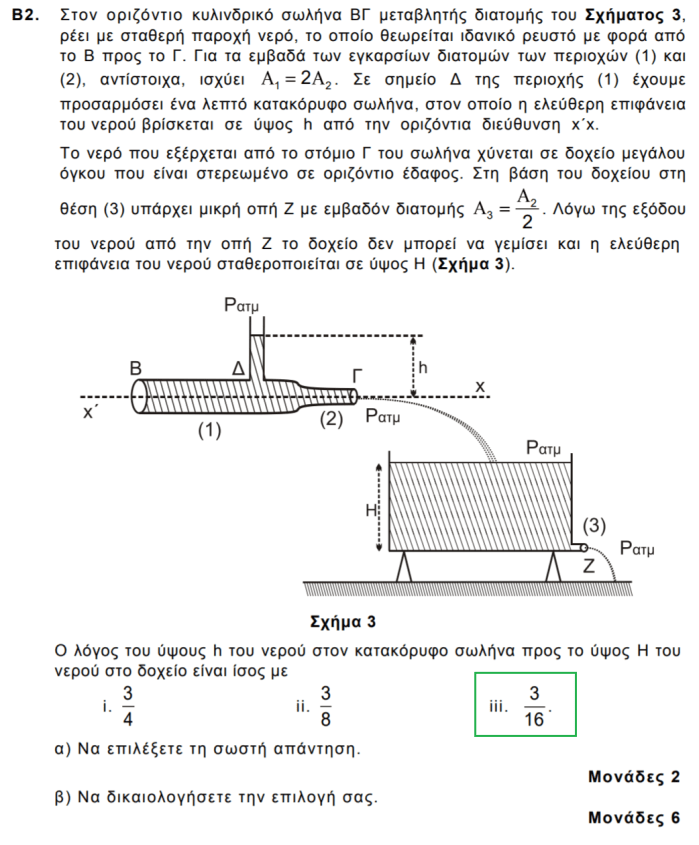 Η στάθμη του δοχείου παραμένει σταθερή: Α2υ2= Α3υ3 και . Συνδυάζοντας τα παραπάνω προκύπτει: h/H=3/16.