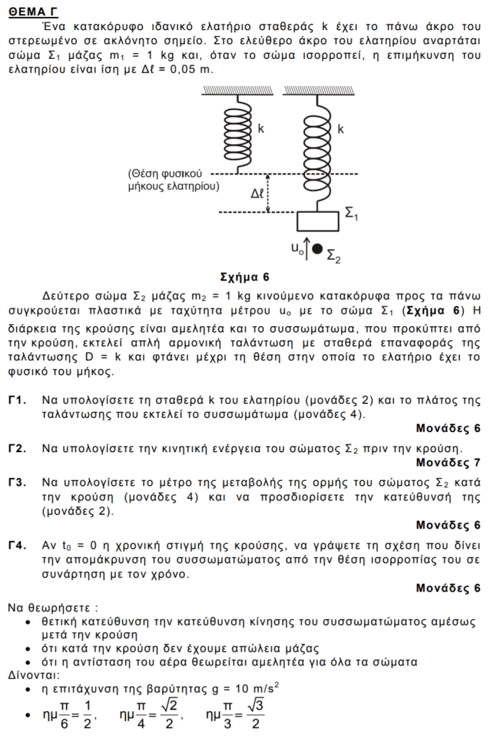Γ1. m1g=kΔℓ => k=200N/m και μετά την κρούση για τη νέα θέση ισορροπίας η επιμήκυνση του ελατηρίου θα είναι Δℓ’=(m1+m2)/k=0,1m=Α. Αυτό είναι και το νέο πλάτος ,αφού το συσσωμάτωμα φτάνει μέχρι τη θέση που το ελατήριο έχει το φυσικό του μήκος.