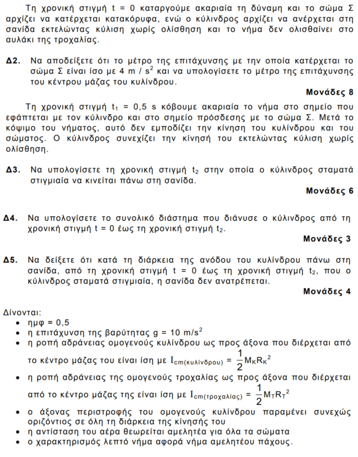 Δ2. Η δύναμη F καταργείται. Για την τροχαλία ισχύει: (Τ’1-Τ’2)RT= ½ MTRT2αγ και για το σώμα Σ: ΜΣg -Τ1= MΣαΣ , όπου αγ RT=αΣ. Για τον κύλινδρο ισχύουν: Tστ+Τ2 – MKgημφ=MKαcm,Κ και Στ(cm)=(T2-Tστ)RK= ½ MΚRΚ2αcm,Κ/RΚ και 2αcm,Κ=αΣ.