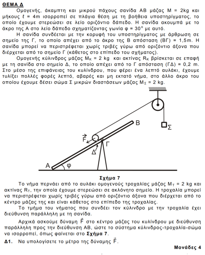 Δ1. Για τον κύλινδρο ισχύει: ΣFx=0 => MKgημφ +F=Tστ+Τ2 και Στ(cm)=(T2-Tστ)RK=0
