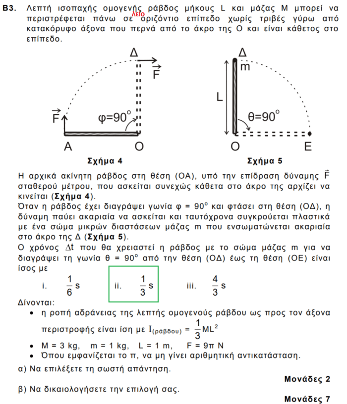 (Εφόσον δεν μας ξεγελάσει το σχήμα και καταλάβουμε ότι το σύστημα βρίσκεται σε λείο οριζόντιο επίπεδο) εφαρμόζουμε ΘΜΚΕ (ΟΑ→ΟΔ):F L π/2 = ½ ΙΟω2→ω=3π r/s. Aρχή Διατήρησης Στροφορμής (υποθέτοντας … ότι η μάζα m είναι ακίνητη πριν την κρούση): ΙΟω=(ΙΟ+mL2)ω’→ ω’=3π/2 r/s. Στη συνέχεια η ράβδος εκτελεί ομαλή στροφική κίνηση, οπότε Δθ=ω’Δt, και Δt=1/3 s.