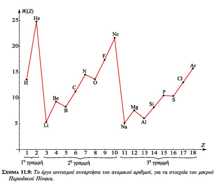 WI=-Εn=13,6 Z2eff/n2 (eV), από όπου είναι φανερό ότι το WI μειώνεται δραστικά σε κάθε αύξηση του n – π.χ. από n=2 σε n=3 – παρ’ ότι αυτή θα αναπληρώνεται μερικώς από την αναμενόμενη αύξηση του Zeff καθώς αυξάνεται το Ζ. (Η θωράκιση δεν μπορεί να εξουδετερώσει πλήρως την αύξηση του καθαρού πυρηνικού φορτίου Ζ και επομένως το Zeff θα είναι εν γένει μια αύξουσα συνάρτηση του Ζ).