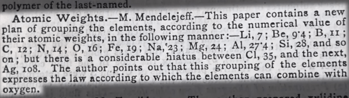 19/12/1869: H πρώτη ανακοίνωση στα αγγλικά για τον περιοδικό πίνακα στοιχείων του Mendeleev, στο περιοδικό «The Chemical News» , που επιμελείτο ο William Crookes.