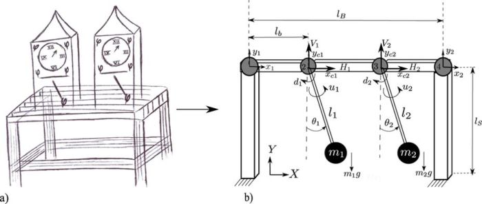 Ο συγχρονισμός οφείλεται στην αλληλεπίδραση των δυο εκκρεμών διαμέσου του κοινού τοίχου στήριξής τους. Για να κατανοήσουμε κάπως το φαινόμενο ας εξετάσουμε το πολύ απλό μοντέλο συζευγμένων εκκρεμών που βλέπουμε στο παρακάτω σχήμα: