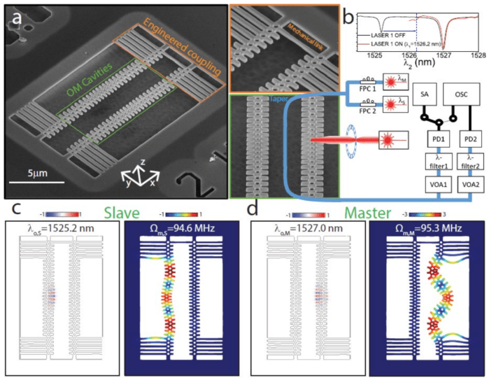 Στα πειράματά τους, η ομάδα έκανε δύο σχεδόν ταυτόσημους φωτονικούς κρυστάλλους. Συνέδεσαν τους κρυστάλλους μέσω ενός λεπτού σύρματος, το οποίο παρείχε μηχανική σύνδεση μεταξύ των ταλαντωτών (όπως ο τοίχος στο πείραμα των ρολογιών-εκκρεμών του Huygens). Οι ερευνητές έθεσαν τους κρυστάλλους σε ταλάντωση με το φως ενός λέιζερ. Έτσι, κάθε κρύσταλλος να παρήγαγε οπτικά και μηχανικά σήματα ανάλογα με τα επαναλαμβανόμενα τικ-τακ ενός ρολογιού. Τα σήματα από τους δύο αρχικά ασύγχρονους κρυστάλλους συγχρονίστηκαν γρήγορα. Ενώ και άλλοι έχουν διεξαγάγει παρόμοια πειράματα, ο Navarro-Urrios λέει ότι αυτή η επίδειξη είναι η πρώτη που δείχνει «ξεκάθαρα» συγχρονισμό σε μικροσκοπίκο ζεύγος οπτομηχανικών κρυσταλλικών κοιλοτήτων .