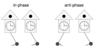 Το επόμενο σχήμα δείχνει τους δυο δυνατούς τρόπους συγχρονισμού των εκκρεμών, σε φάση και σε αντίθεση φάσης: