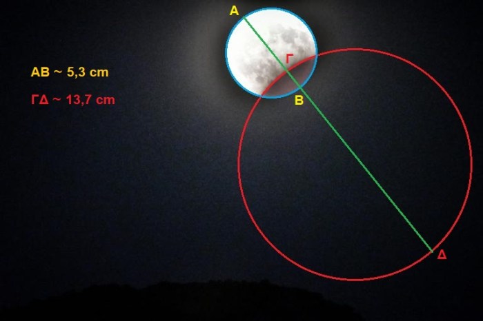Υπολογίστε την ακτίνα της Σελήνης παρατηρώντας την έκλειψη: Rσελήνης=Rγης/(1+ΓΔ/ΑΒ)