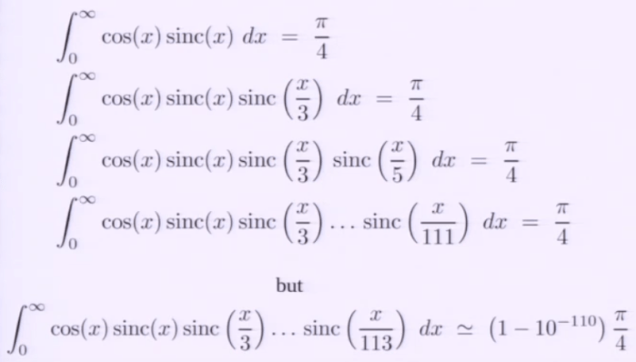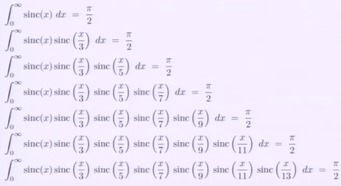 όπου sinc(x)=sin(x)/x η συνάρτηση δειγματοληψίας. Όταν όμως υπολογίζει κανείς το επόμενο (το όγδοο κατά σειρά) ολοκλήρωμα παίρνει ένα αποτέλεσμα, σχεδόν ίσο με π/2, αλλά σίγουρα διαφορετικό: