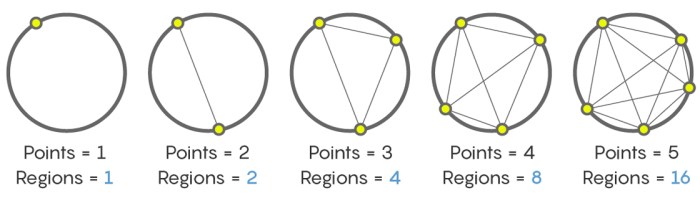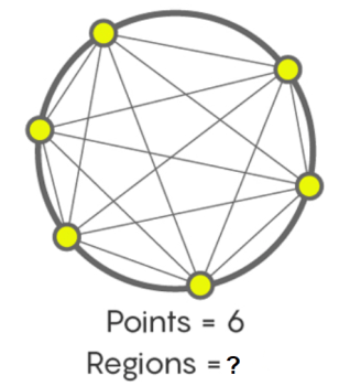Σχεδιάστε έναν κύκλο. Θεωρείστε διαδοχικά n=1, 2, 3, …, σημεία στην περιφέρεια του κύκλου. Ενώστε τα σημεία μεταξύ τους και μετρήστε σε πόσες διαφορετικές περιοχές διαιρείται ο κύκλος.