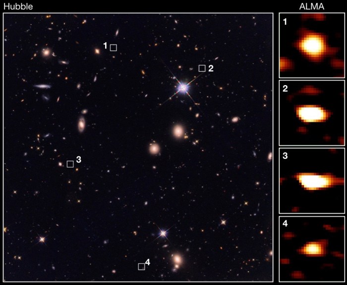 Αυτοί οι γαλαξίες δεν είχαν εντοπιστεί μέχρι σήμερα, επειδή δεν μπορούσε να τους δει το οπτικό διαστημικό τηλεσκόπιο Hubble, καθώς το φως τους φθάνει σε μήκη κύματος έξω από το ορατό φάσμα (υπέρυθρο). Αλλά έγιναν αντιληπτοί από το ALMA, που «βλέπει» σε αυτό το τμήμα του ηλεκτρομαγνητικού φάσματος. Οι ερευνητές, με επικεφαλής τον αστροφυσικό Τάο Γουάνγκ του Πανεπιστημίου του Τόκιο, έκαναν τη σχετική δημοσίευση στο περιοδικό «Nature».