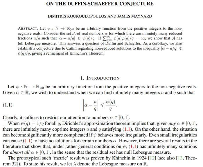 Ο Δημήτρης Κουκουλόπουλος, ένας Έλληνας καθηγητής μαθηματικών κατάφερε να λύσει μαζί με τον συνεργάτη του James Maynard, έναν μαθηματικό γρίφο που παράμενε άλυτος για 78 χρονιά, συγκεκριμένα την «Εικασία των Duffin και Schaeffer«
