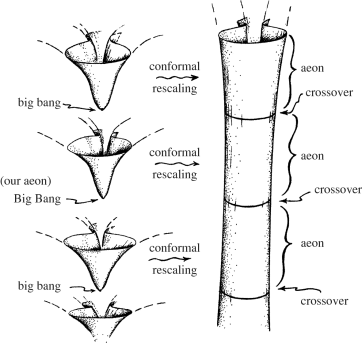 Σχηματική αναπαράσταση της Σύμμορφης Κυκλικής Κοσμολογίας (CCC). Η εικόνα σχεδιάστηκε έτσι ώστε οι γεωμετρίες να είναι είτε όλες ανοιχτές είτε όλες κλειστές