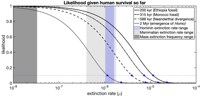 Όπως λένε οι ερευνητές, «χρησιμοποιώντας μόνο την πληροφορία ότι ο Homo sapiens έχει υπάρξει για τουλάχιστον 200.000 χρόνια, συμπεραίνουμε πως η πιθανότητα η ανθρωπότητα να εξαφανιστεί λόγω φυσικών αιτίων μέσα σε οποιοδήποτε έτος είναι σχεδόν εγγυημένο ότι είναι μικρότερη από μία στις 14.000 και πιθανώς είναι μικρότερη και από μία στις 87.000».