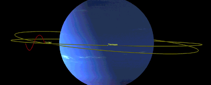 Στο πλαίσιο αυτής της αέναης «χορογραφίας», η Ναϊάς περιστρέφεται γύρω από τον παγωμένο γίγαντα κάθε επτά ώρες, ενώ η Θάλασσα κάνει επτάμισι ώρες. Ένας παρατηρητής στη Θάλασσα θα έβλεπε τη Ναϊάδα σε μια τροχιά που παρουσιάζει μεγάλες μεταβολές, σε μια τεθλασμένη πορεία, να περνά δύο φορές από πάνω και δύο φορές από κάτω. Αυτή η κίνηση επαναλαμβάνεται κάθε φορά που η Ναϊάς «ρίχνει τέσσερις γύρους» στη Θάλασσα.
