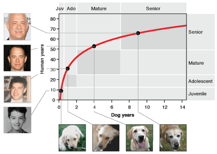 Με βάση τη νέα φόρμουλα, ένα σκυλάκι επτά εβδομάδων αντιστοιχεί βιολογικά σε ένα ανθρώπινο μωρό εννέα μηνών, μια ηλικία περίπου που και τα δύο είδη αρχίζουν να βγάζουν δόντια. Ένας σκύλος ράτσας «Λαμπραντόρ», που κατά μέσο όρο ζει 12 χρόνια, έχει το μέσο παγκόσμιο προσδόκιμο ζωής ενός ανθρώπου (70 χρόνια).
