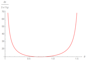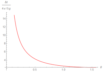 Παρατηρούμε ότι τώρα το ζητούμενο χρονικό διάστημα συναρτήσει της γωνίας θ μειώνεται, όπως αναμένεται, και για θ=π/2 προκύπτει . Είναι ο ολικός χρόνος κίνησης ενός σώματος που εκτελεί κατακόρυφη βολή προς τα πάνω φτάνοντας σε μέγιστο ύψος