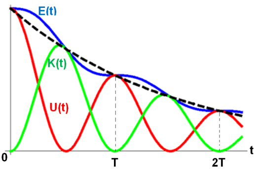 Έχοντας κατά νου την παραπάνω εξίσωση, προκύπτει η γραφική παράσταση της ενέργειας ταλάντωσης συναρτήσει του χρόνου (η μπλε καμπύλη):