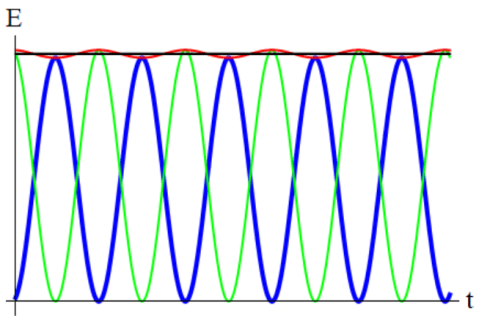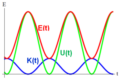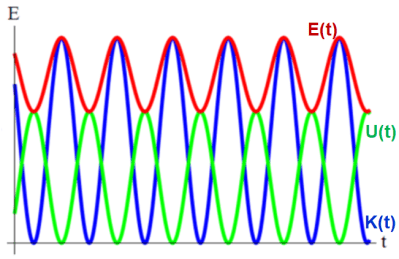Η μπλε καμπύλη παριστάνει την κινητική ενέργεια, η πράσινη την δυναμική και η κόκκινη την ολική ενέργεια του ταλαντωτή