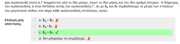 αλλά, ενώ είναι η επιστημονικά σωστή επιλογή … τελικά επρόκειτο για τυπογραφικό λάθος, που διορθώθηκε. Η σωστή (για μαθητές) απάντηση θεωρείται η ΒΑ=ΒΓ, διότι σύμφωνα με το σχολικό βιβλίο στο άκρο του σωληνοειδούς το μέτρο της έντασης είναι το μισό του μέτρου της έντασης στο κέντρο του (το οποίο είναι ανεξάρτητο της διαμέτρου του σωληνοειδούς):