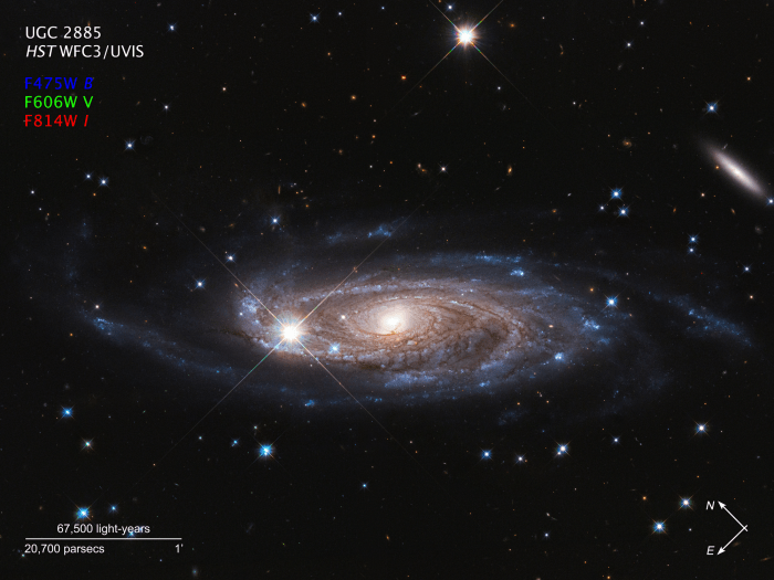 Η εκπληκτική αυτή φωτογραφία δόθηκε στην δημοσιότητα από την NASA και τον ESA στις 6 Ιανουαρίου, με αφορμή την 30ή επέτειο (στις 24 Απριλίου) από την εκτόξευση του γερασμένου, αλλά θρυλικού πλέον διαστημικού τηλεσκοπίου Hubble. Εκτός από τον γαλαξία UGC 2885, στην φωτογραφία αυτή απεικονίζονται και αρκετά άστρα του Γαλαξία μας, με χαρακτηριστικότερο παράδειγμα αυτή την υπέρλαμπρη φωτεινή πηγή στον δίσκο του γαλαξία, που θυμίζει κάπως μία έκρηξη σουπερνόβα. Στην πραγματικότητα πρόκειται για ένα άστρο του Γαλαξία μας, το οποίο βρίσκεται σε απόσταση μόλις 2.500 ετών φωτός από την Γη και το οποίο παρεμβάλλεται τυχαία ανάμεσα στο τηλεσκόπιο και τον γαλαξία της φωτογραφίας. Πιθανότατα είναι ένα άστρο παρόμοιο, αλλά μεγαλύτερης ηλικίας από τον Ήλιο, καθώς το υδρογόνο στον πυρήνα του πρέπει να εξαντλείται [φωτογρ. NASA, ESA, and B. Holwerda (University of Louisville)].
