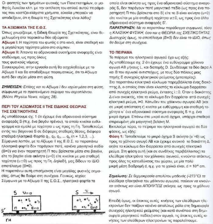 1. Ποιο Griffiths κεφ. 12; Ας ανοίξουν ένα βιβλίο λυκείου, από τη δεκαετία του 90, γιατί δεν ξέρω αν διδάσκουν βασικό ηλεκτρομαγνητισμό πια, για να μορφωθούν αν το ρεύμα από τα ηλεκτρόνια μόνο παράγει μαγνητικό πεδίο ή όχι. Γιατί αυτό αμφισβητεί το άρθρο, την ισοδυναμία ανάμεσα στο ακίνητο σύστημα όταν έχεις ρεύμα και στο σύστημα που κινείται με την ταχύτητα των ηλεκτρονίων που προκύπτει από το ρεύμα, το σύστημα που κινείται δηλαδή μαζί με τα ηλεκτρόνια.