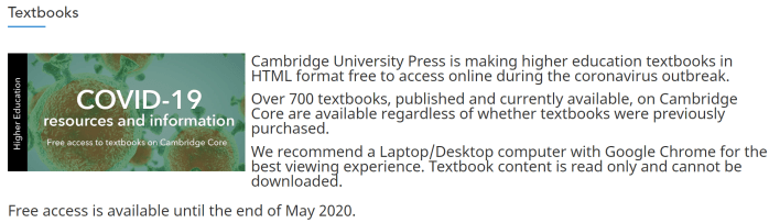 Οι εκδόσεις του πανεπιστημίου Cambridge επιτρέπουν την ελεύθερη πρόσβαση στα πανεπιστημιακά τους βιβλία (σε μορφή HTML) κατά την διάρκεια της επιδημίας του κορωνοϊού (προς το παρόν μέχρι το τέλος Μαΐου). Μιλάμε για 700 βιβλία που μπορούν να προβληθούν π.χ. με το Google Chrome, σε έναν οποιοδήποτε υπολογιστή που έχει απλή πρόσβαση στο διαδίκτυο.