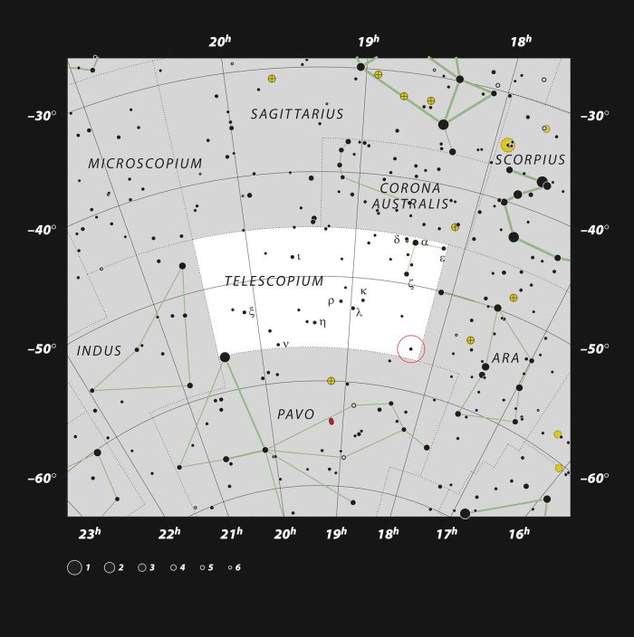 Αυτός ο χάρτης δείχνει την θέση στον αστερισμό του Τηλεσκοπίου, του τριπλού συστήματος HR 6819 που περιλαμβάνει και την πλησιέστερη στην Γη μαύρη τρύπα. Ενώ η μαύρη τρύπα είναι αόρατη, τα δυο άστρα του HR 6819 φαίνονται στον νυχτερινό ουρανό του νοτίου ημισφαιρίου με γυμνό μάτι.