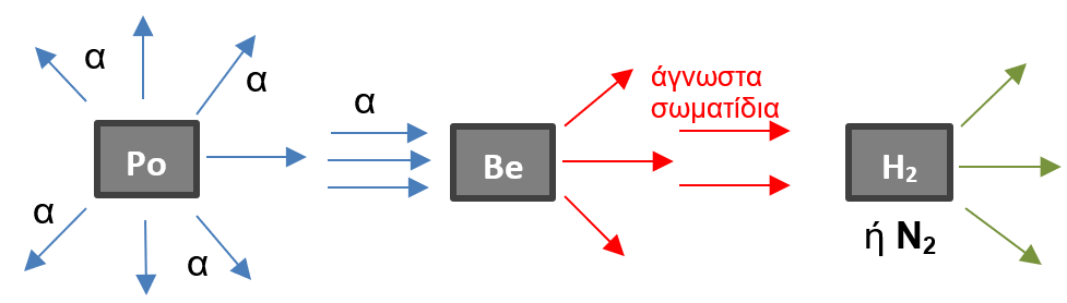 O Chadwick παρατήρησε ότι, όταν το στοιχείο Βηρύλλιο (Be) βομβαρδιστεί από σωμάτια α (πυρήνες He), που εκπέμπονται από το ραδιενεργό Πολώνιο (Po), τότε το Be εκπέμπει καινούργια, άγνωστα μέχρι τότε σωματίδια μεγάλης διεισδυτικής ικανότητας, που είναι δυνατό να συγκρουστούν με ακίνητους πυρήνες υδρογόνου ή αζώτου και να προκαλέσουν την κίνησή τους.