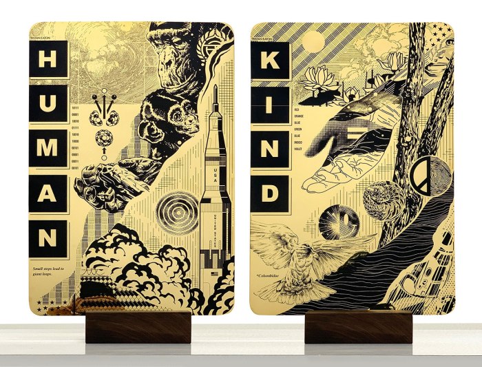 «Ως καλλιτέχνης προσπαθώ να έχω μια μεγαλύτερη θέαση του κόσμου» είχε γράψει, στον λογαριασμό του στο Instagram, ο Tristan Eaton. «Κανείς δεν έχει μεγαλύτερη θέαση του κόσμου μας από ό,τι οι γενναίοι αστροναύτες μας στον Διεθνή Διαστημικό Σταθμό». Κάθε πλάκα έχει δύο όψεις, επιλογή που θέλει να «αντιπροσωπεύσει τη διττότητα του Ανθρώπινου Είδους, το παρελθόν μας και το μέλλον μας» όπως τονίζει ο δημιουργός. Κάθε πλάκα φέρει επάνω της μια ποικιλία συμβόλων: ένα τεντωμένο χέρι και έναν θηλυκό χιμπατζή με το παιδί της, παρουσιάζοντας την πυρηνική σχάση. Μια σειρά λουλουδιών που ξεδιπλώνεται, ένα σύμβολο της ειρήνης και τα αστέρια και τις λωρίδες της Αστερόεσσας, της σημαίας των ΗΠΑ.