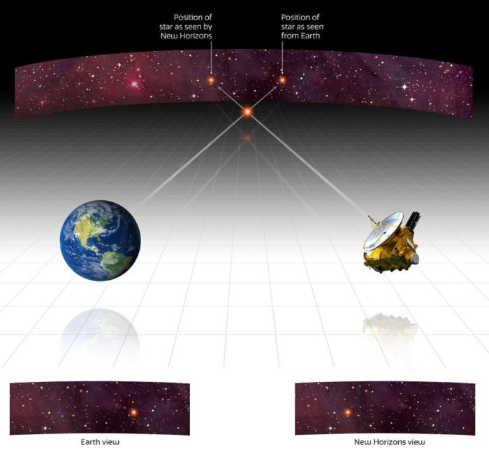 Μια επεξηγηματική εικόνα γιατί οι «Νέοι Ορίζοντες» βλέπουν τα δυο άστρα (Εγγύτατο Κενταύρου και Wolf 359) σε διαφορική θέση σε σχέση με έναν παρατηρητή στη Γη